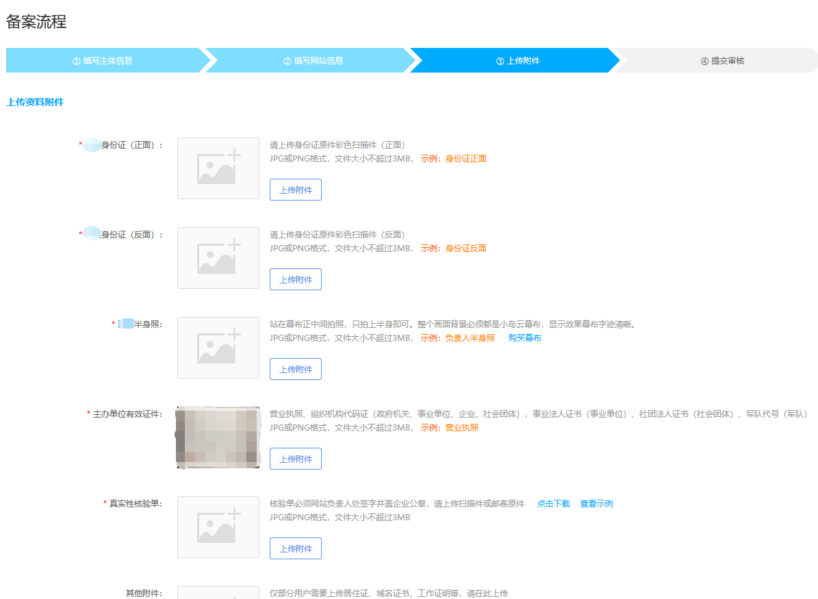 按照备案所需的电子版资料上传备案资料,每个省份的要求会有所不同,详细要求请阅览各省份备案规则进行查询 企业备案:附件中必须上传的备案附件有5个,分别为: ①主体单位有效证件(营业执照彩色扫描件,不能是黑白复印件) ②主体负责人有效证件(法人的身份证正反面彩色扫描件) ③网站负责人证件(网站负责人的身份证正反面彩色扫描件) ④网站负责人真实性核验照片(站于幕布正中间,拍上半身即可,显示效果幕布字迹清晰) ⑤网站备案真实性核验单彩色扫描件(核验单必须网站负责人处签字并盖企业公章) ⑥域名实名认证核验证明 个人备案:附件中必须上传的附件有3个,分别为: ①主体单位有效证件(备案人身份证正反面扫描件) ②网站负责人真实性核验照片(提供腰部以上不可戴帽子或眼镜,双手垂立的幕布半身照) ③网站备案真实性核验单彩色扫描件(核验单底部必须手写签字) ④域名实名认证核验证明 上传完整所有的附件资料,选择“确认附件信息,下一步”;如果网站信息还需要进行修改,则可以进行选择“上一步”,修改网站信息 6、确认备案信息,提交备案进行内审